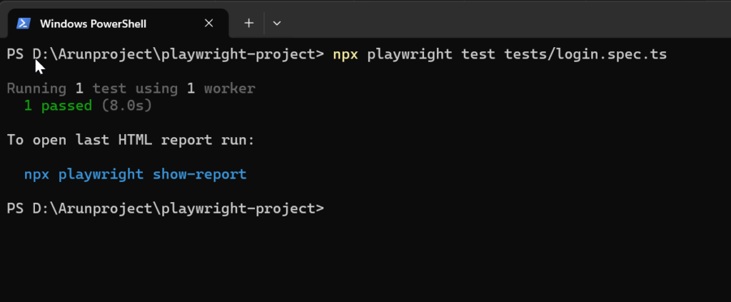 Now to run the code in the terminal use the npx playwright test command followed by the path to your specific test file.