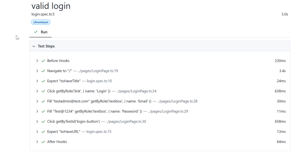 clicks the login button . This action submits the login form. Playwright automatically waits for the element to be actionable before performing the click, ensuring stable execution.