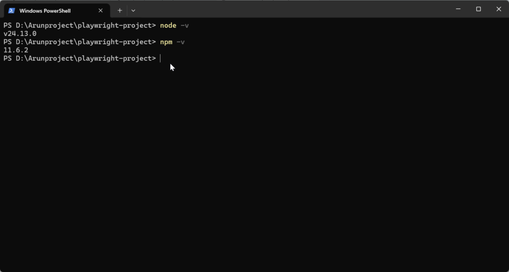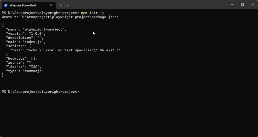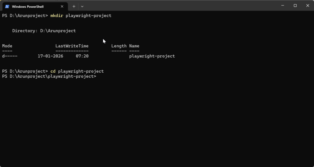 mkdir playwright-project – This command creates a new folder (directory) named playwright-project
