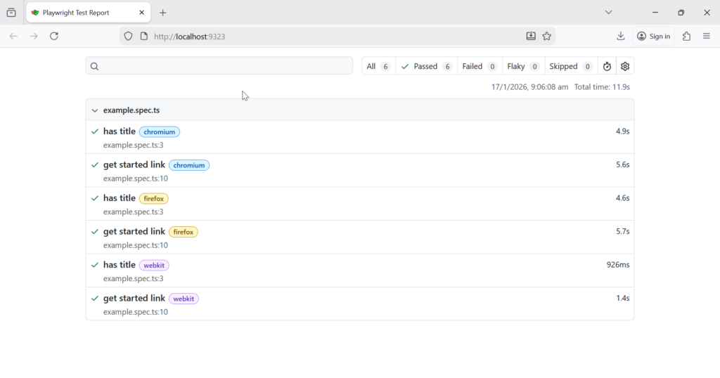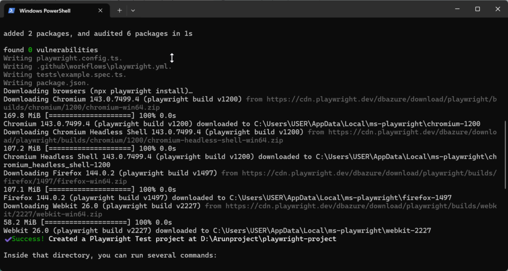 - Downloads required browsers (Chromium, Firefox, WebKit)